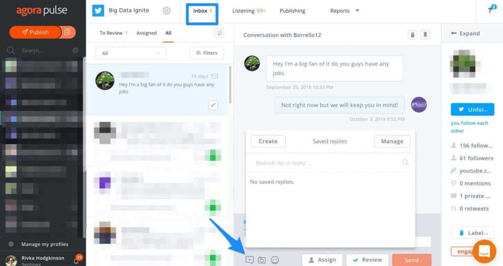 Puedes crear respuestas de forma nativa en Facebook, pero si utilizas herramientas como Agorapulse podrás hacerlo también en LinkedIn, Twitter e Instagram. Verás esta opción activa en tu Inbox, debajo del área de mensajes.