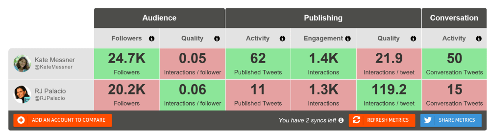 Puedes usar una herramienta como Twitter Report Card para visualizar de forma muy sencilla qué tan activo es su público en Twitter. Mira las diferencias de estos autores con un número de seguidores similar.