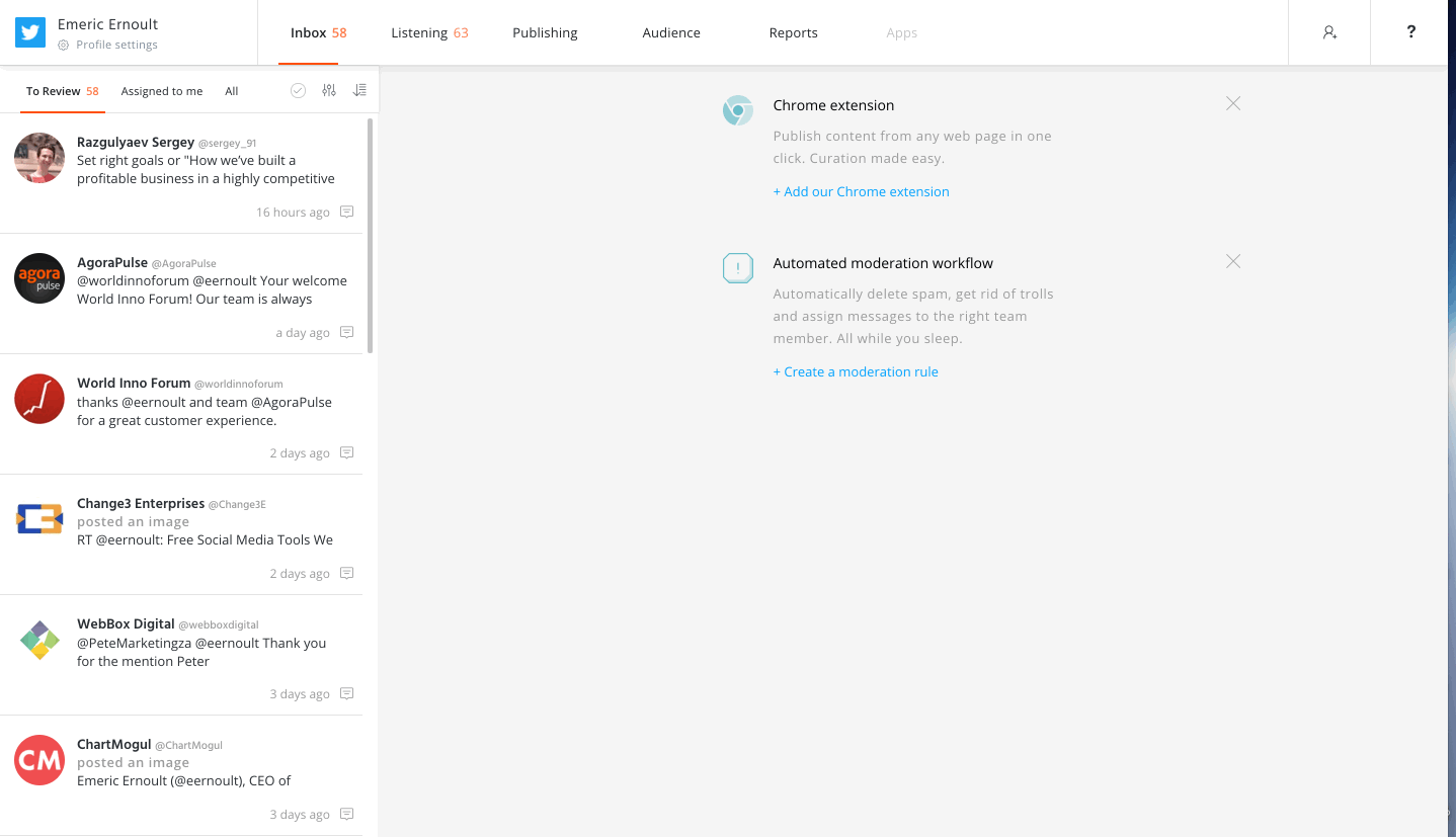 De son côté, Agorapulse va plus loin : au-delà de la programmation, vous accédez à une boîte de réception sociale unifiée, un module complet de reporting, un outil de veille sociale (aussi appelé social listening), la gestion des publicités sociales, et bien plus encore.