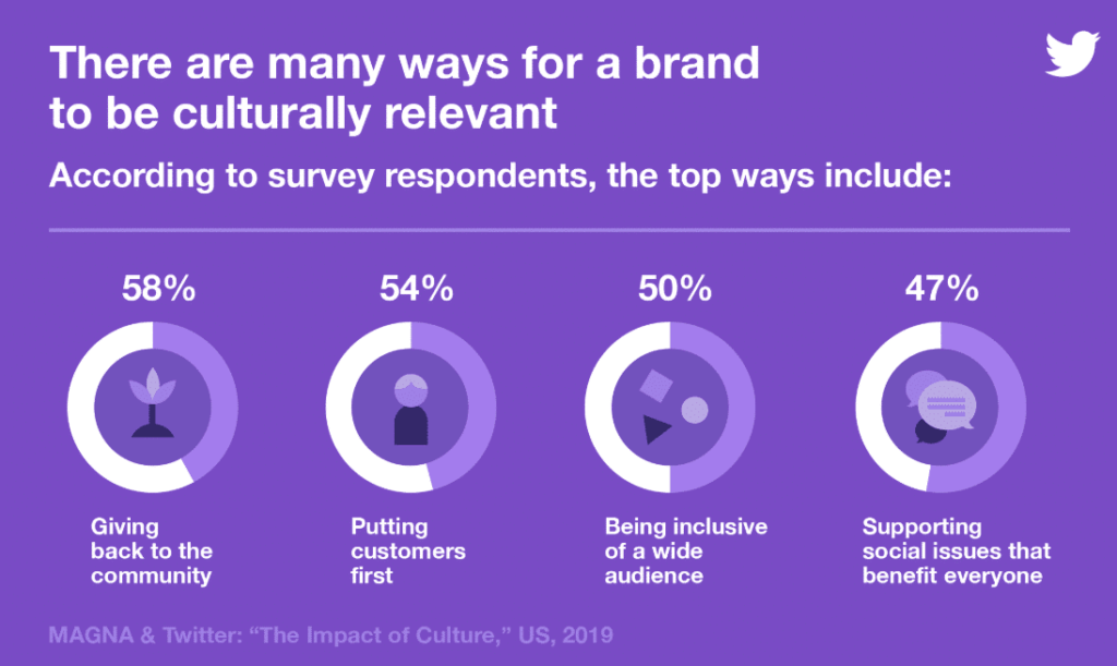 Petit tip pour les Community Manager et Social Media Manager : Les utilisateurs de Twitter sont passionnés et surtout informés, il est donc important pour eux que les marques s’alignent sur les sujets d’actualités et plus largement les événements de société. L’enquête sur l’impact de la culture souligne l’importance sociétale et montre comment y parvenir, la suggestion la plus populaire étant de “redonner à la communauté”.