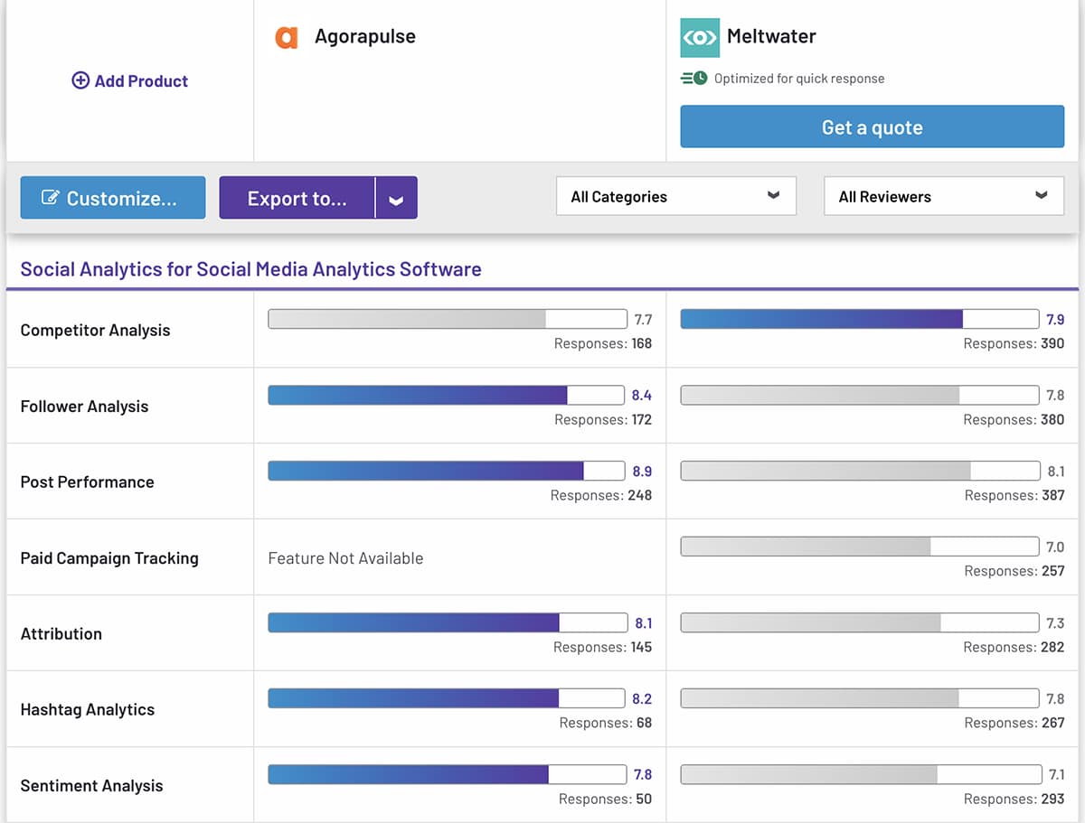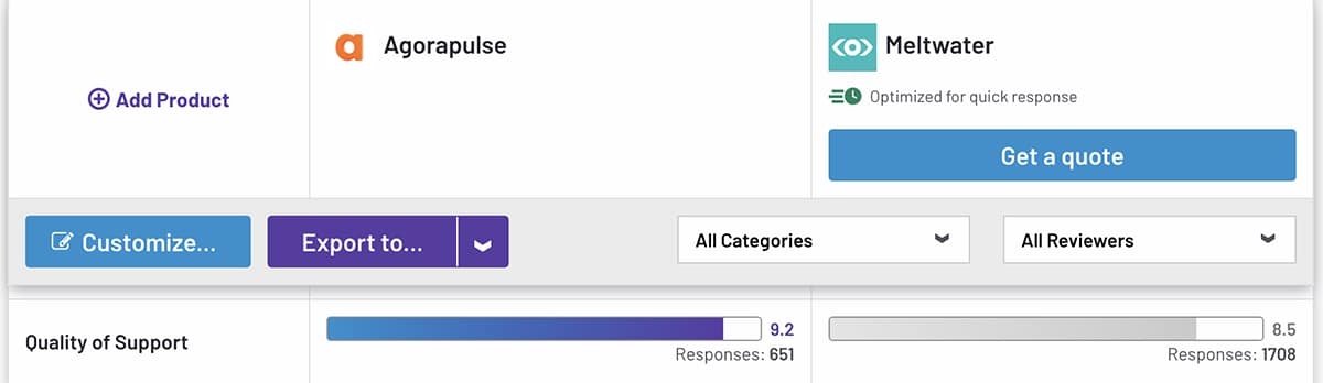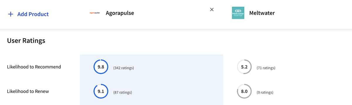 Dans l’expérience des utilisateurs de G2, Agorapulse dépasse Meltwater en termes d’orientation produit et de partenariat commercial. Agorapulse obtient une note de 9,1 dans les deux domaines, tandis que Meltwater obtient un 7,8 pour le premier et un 8,3 pour le second.