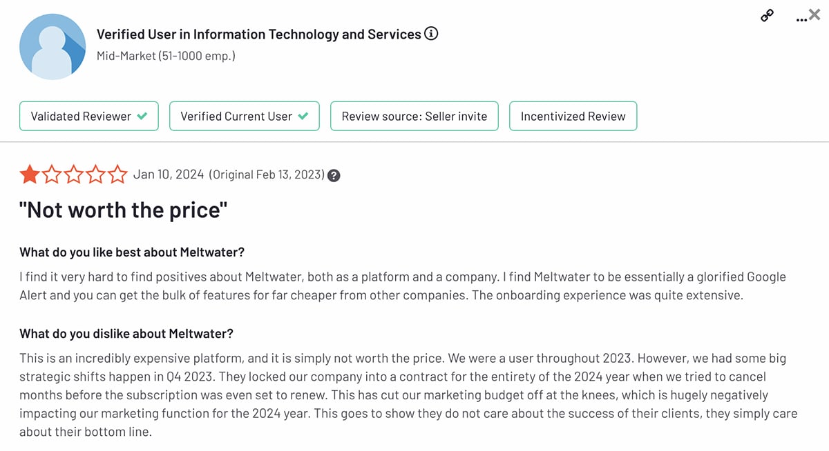 Comme le résume un utilisateur de G2 sur son expérience avec Meltwater : “C’est une plateforme incroyablement chère, et elle ne vaut tout simplement pas le prix.”