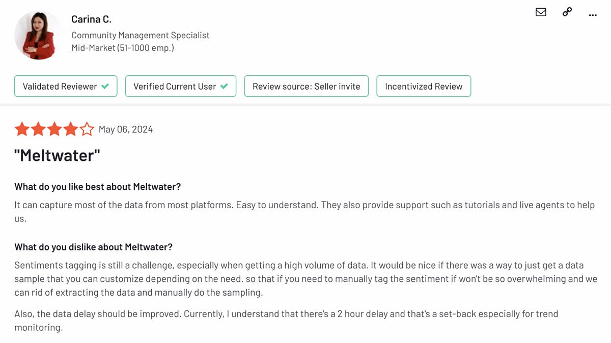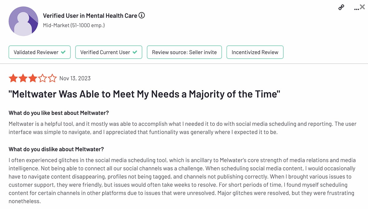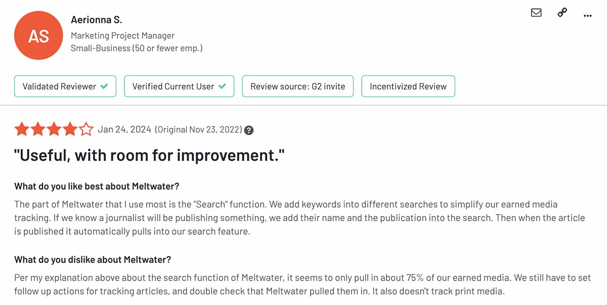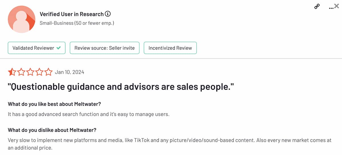 Comme l’indique un utilisateur de G2, les outils de veille et de suivi de marque de Meltwater ne sont pas toujours fiables. “Il semble qu’ils ne recueillent qu’environ 75 % de nos réseaux sociaux. Nous devons toujours mettre en place des actions de suivi, et vérifier à nouveau que Meltwater les a bien récupérés.”