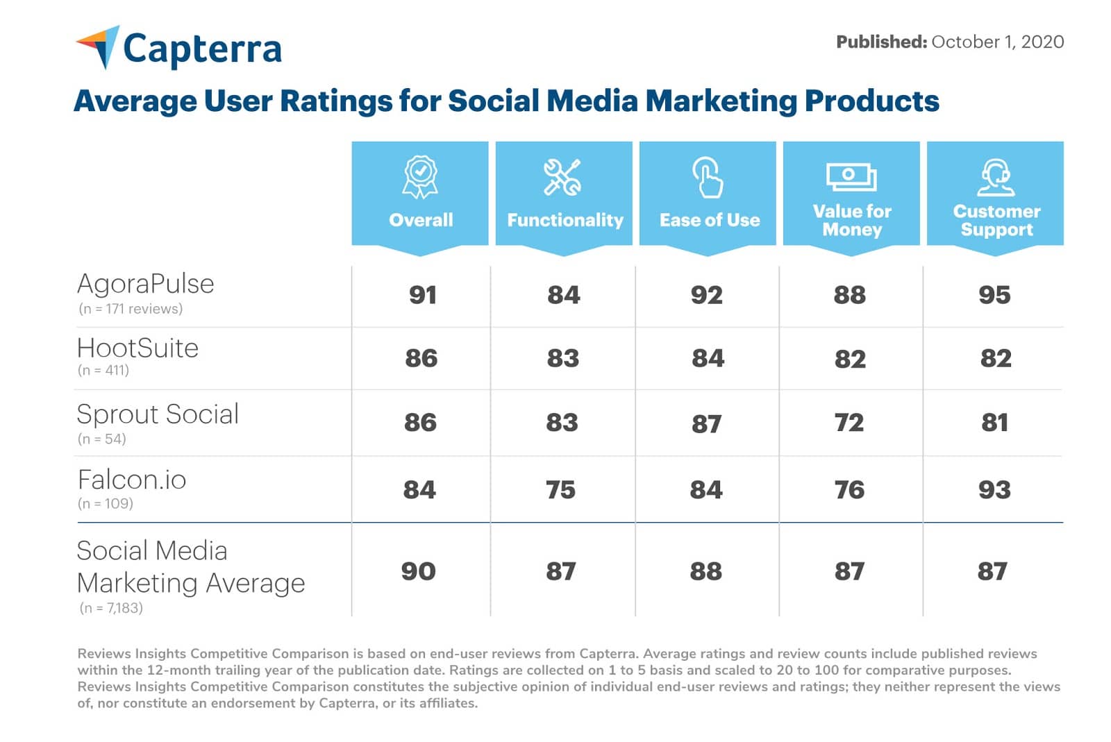 Cela pourrait être une raison pour laquelle Sprout Social a un score plus bas en termes de valeur par Capterra. Il se classe à 72, Hootsuite se classe à 82, et Agorapulse gagne avec un score de 88.