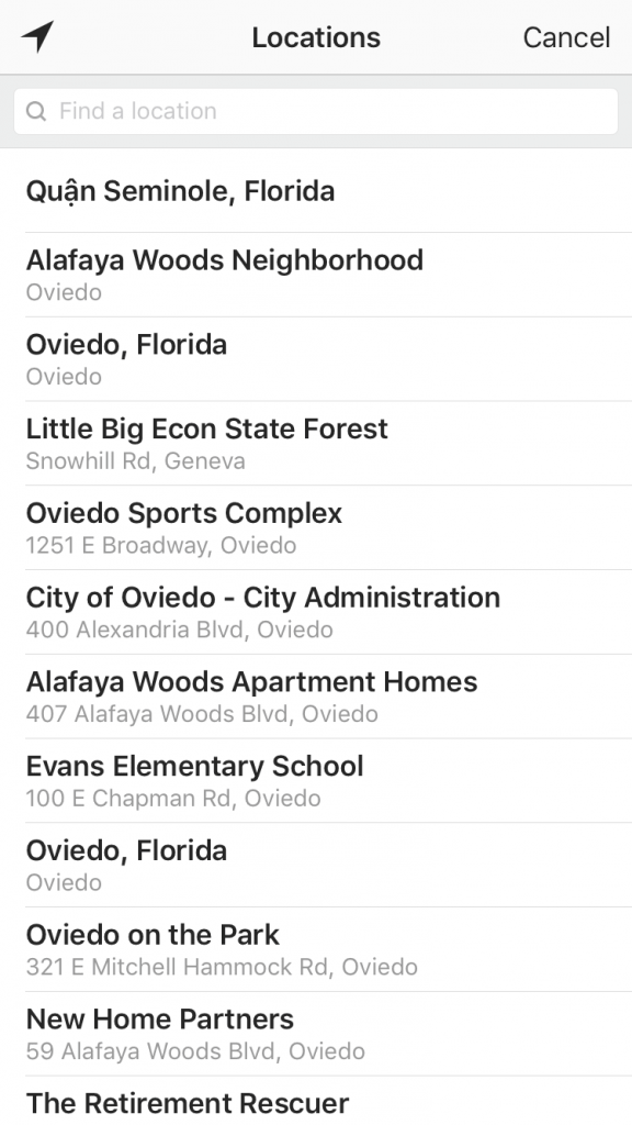 Les stickers de localisation fonctionnent comme les stickers d’hashtag. Une fois que vous avez sélectionné le sticker, il suffit de rechercher le lieu que vous voulez ajouter. Vous pouvez indiquer le nom d’un profil comme par exemple “QG d’Agorapulse” ou un lieu plus commun tel que “Downtown Orlando”.