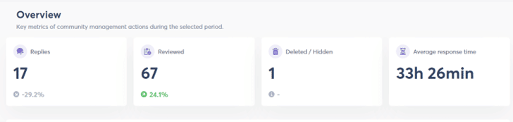 Et enfin, il y a l’onglet “Community Management”, qui vous montre combien de réponses vous avez envoyées et le temps qu’il vous a fallu pour y répondre. Comme vous pouvez le voir, nous avons un temps de réponse moyen de 33 heures et 26 minutes. Mais (attention !) cela était avant d’avoir commencé à utiliser TikTok avec Agorapulse. Maintenant, nous pouvons répondre en temps réel et réduire considérablement ce chiffre !