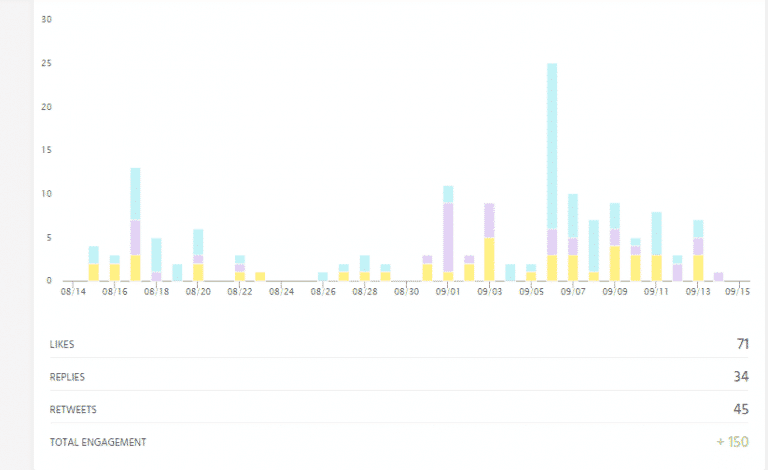 Ces métriques d’engagement s’appliquent à la plupart des réseaux sociaux et constituent d’excellents KPI. Vous pouvez voir avec la capture d’écran ci-dessus de mon engagement sur Twitter que le panneau de rapport Agorapulse vous permet de surveiller chacun de ces KPI !