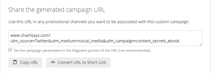 Vous pouvez également vous aider en créant des URL de campagne pour chaque campagne payée sur les réseaux sociaux. J’aime le créateur d’URL Google car il est facile de paramétrer ma campagne et de créer une URL personnalisée. Idéalement, vous devriez le faire pour chaque plateforme pour pouvoir suivre facilement vos prospects.