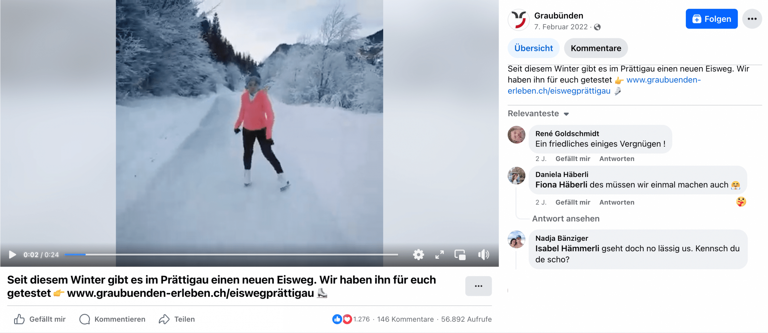 La publication sur les façons de porter ses skis aborde des situations quotidiennes que de nombreux skieurs et amateurs de sports d’hiver connaissent. Ils peuvent donc facilement s’identifier. Cette reconnaissance favorise l’engagement. Les utilisateurs se reconnaissent eux-mêmes ou reconnaissent d’autres personnes dans les types présentés. Dans la vidéo du chemin de glace, les spectateurs peuvent partager la joie et le plaisir qu’ils pourraient ressentir en patinant sur la glace.