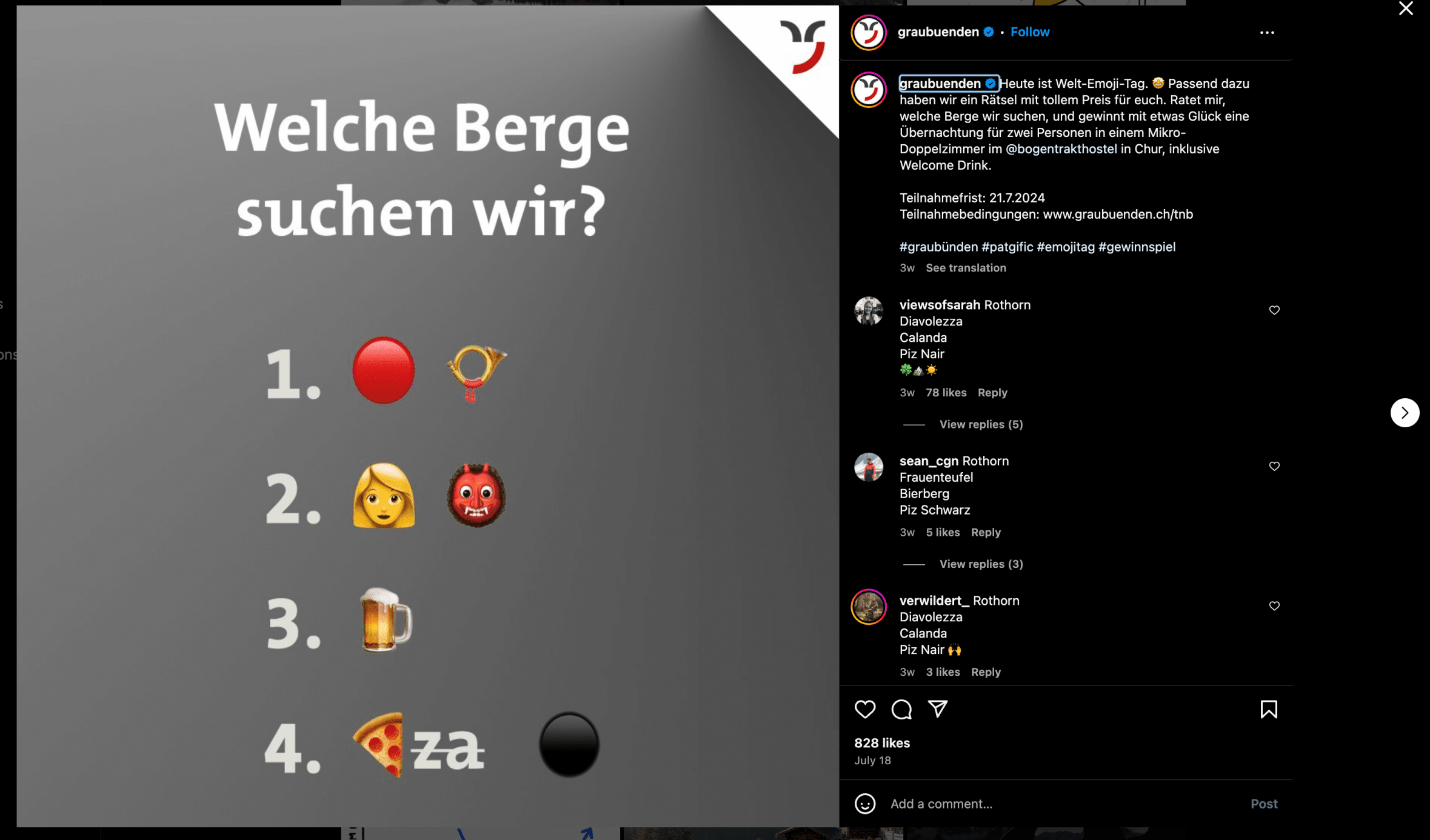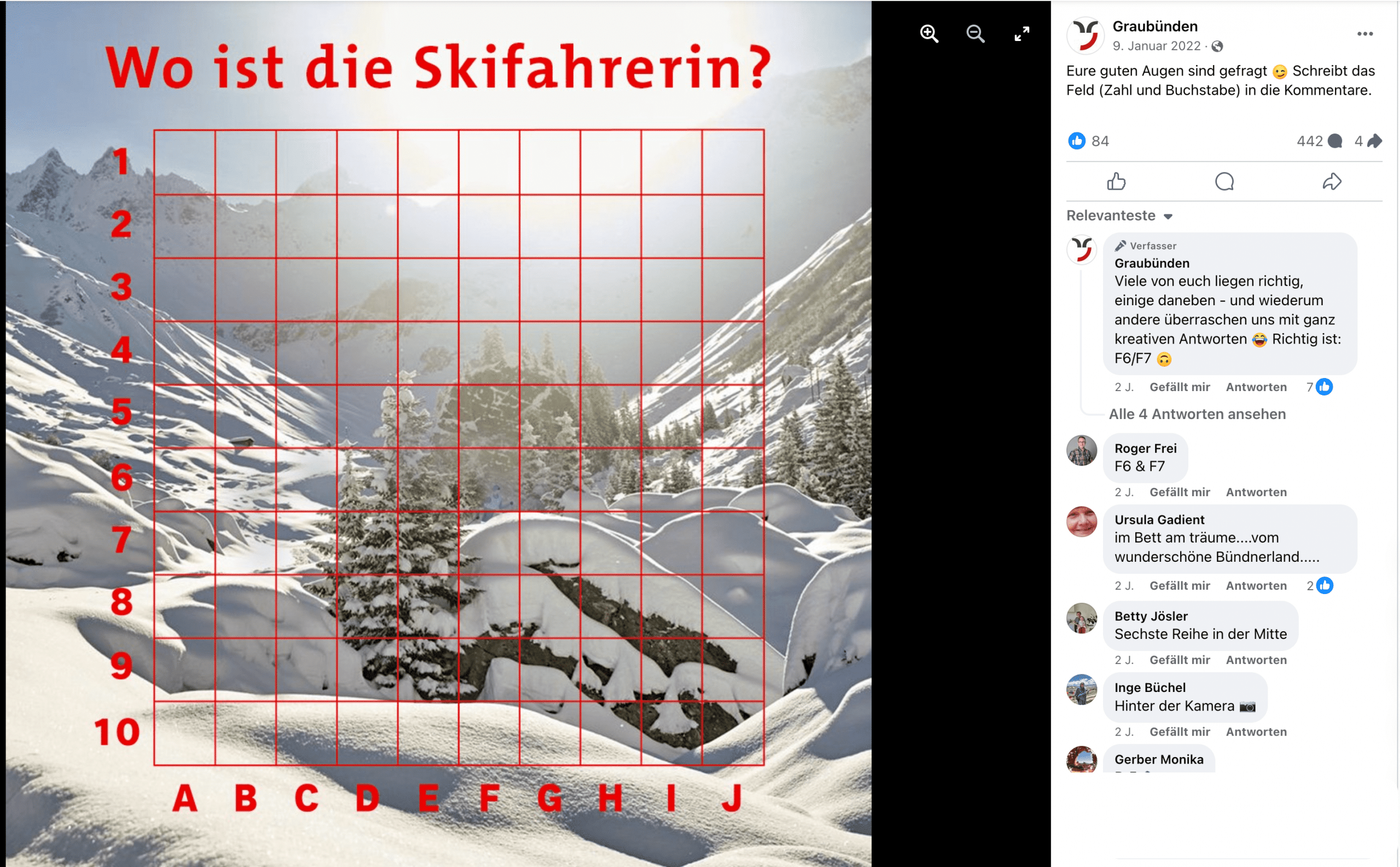 Les devinettes sont fortement liées à la région des Grisons. Cela en fait un sujet particulièrement intéressant pour les habitants ou les visiteurs réguliers. Cet ancrage local crée une connexion émotionnelle et augmente la probabilité que les utilisateurs participent et partagent la publication.