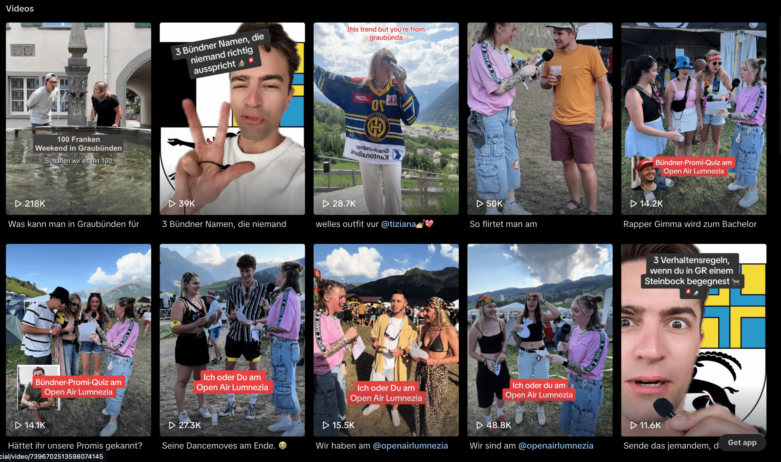 La GRF utilise TikTok pour présenter les événements de la région. Ainsi, elle implique activement le public. Des interviews et des jeux lors d’événements comme le SunIce Festival et l’Open Air Lumnezia montrent le côté vivant de la région et s’adressent directement aux jeunes visiteurs.