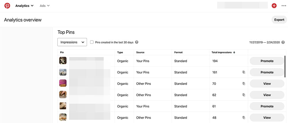 - Impressions : Le nombre de fois que vos Pins sont apparus dans les recherches ou les flux.