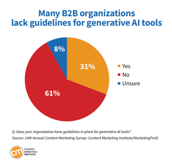 Selon le 2024 B2B Content Marketing Report du Content Marketing Institute, de MarketingProfs et de Bright Spot, le plus grand problème auquel sont confrontés les marketeux est le manque de directives pour les outils d’IA générative.