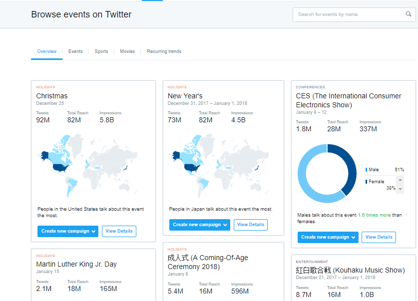 Si vous tenez à avoir de l’engagement, vous devez savoir ce qu’il se passe. Que ce soit #SundayFunday , #HarryetMeghan ou #JoyeuxNoël, il est important de savoir de quoi tout le monde parle. Cela ne signifie pas pour autant que vous devez insérer votre marque dans chaque conversation – au contraire, s’il vous plaît ne le faites pas ! Cependant, avec une simple recherche vous pouvez trouver un hashtag tendance qui correspond à votre offre. Essayez de rester à l’écart de la politique ou des sujets controversés, surtout s’ils n’ont rien à voir avec votre marque. Au lieu de cela, recherchez des hashtags funs ou intéressants que vous pouvez intégrer à votre message. Vous pouvez également utiliser l’onglet Événements de Twitter pour vérifier ce qui est susceptible d’être tendance dans les semaines et les mois à venir.